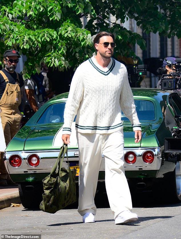 Channelling a timeless, collegiate vibe, Kelce donned a sharp, cream-colored cable-knit cricket sweater. The sweater’s deep V-neck and cuffs were accented with smart green stripes, adding a touch of color to the clean aesthetic. He paired the iconic top with relaxed, wide-leg white trousers and pristine white sneakers, creating a look that was both comfortable and impeccably put-together.