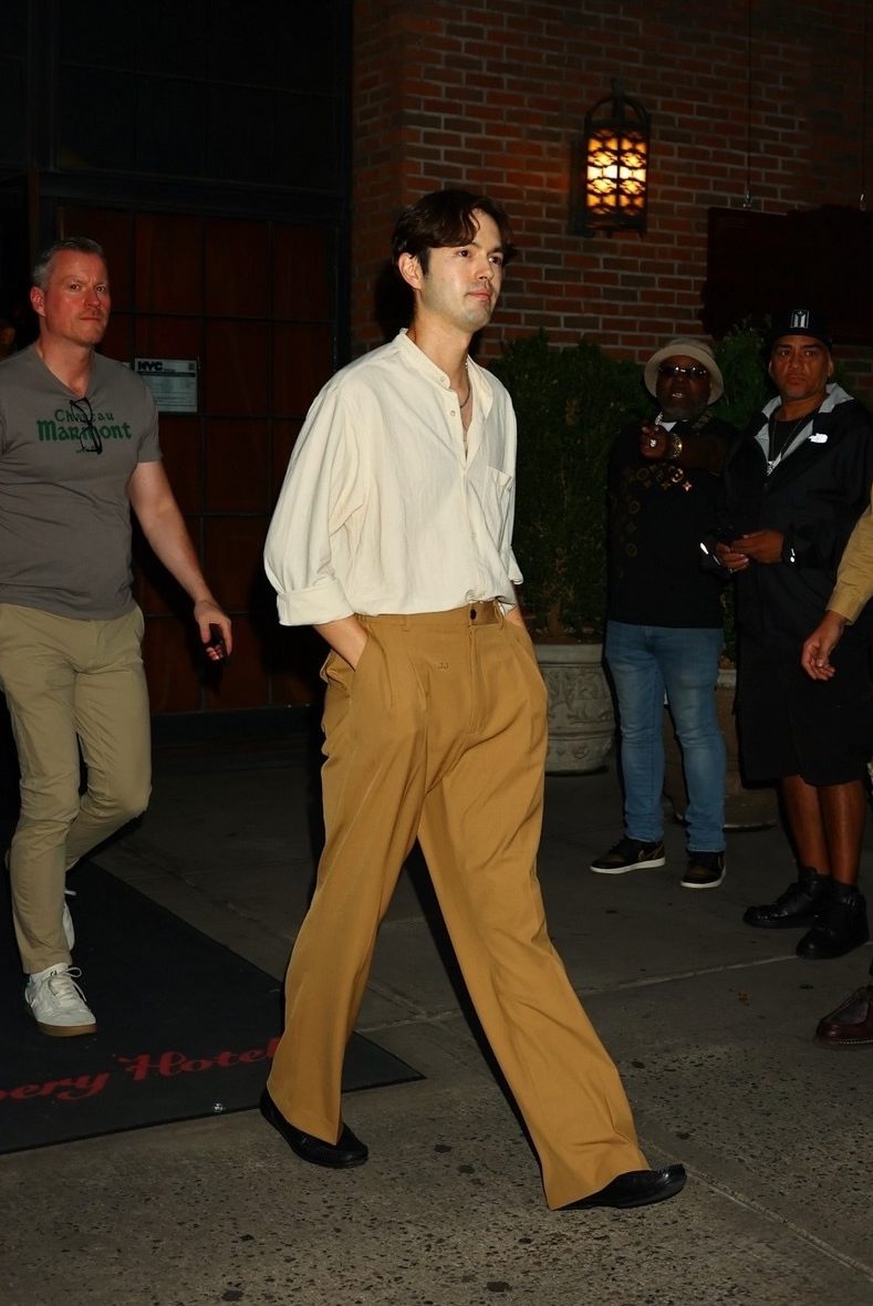 Sweeney was seen sporting a breezy, off-white collared shirt with subtly puffed sleeves, giving the look a romantic, slightly vintage feel. He paired the top with high-waisted, wide-leg trousers in a rich, earthy brown. The relaxed fit of the pants created a beautifully elongated silhouette, while the pleated front added a touch of tailored sophistication. He completed the outfit with sleek, dark-colored shoes, allowing the flowy trousers to remain the focal point.